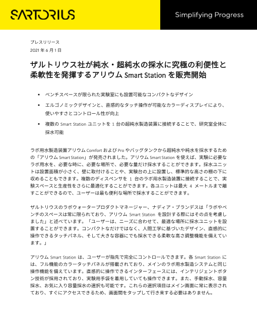 ラボ用水製造装置アリウムComfortおよびProやバッグタンクから超純水や純水を採水するための『アリウムSmart Station』が発売されました。実験に必要なラボ用水を、必要な時...