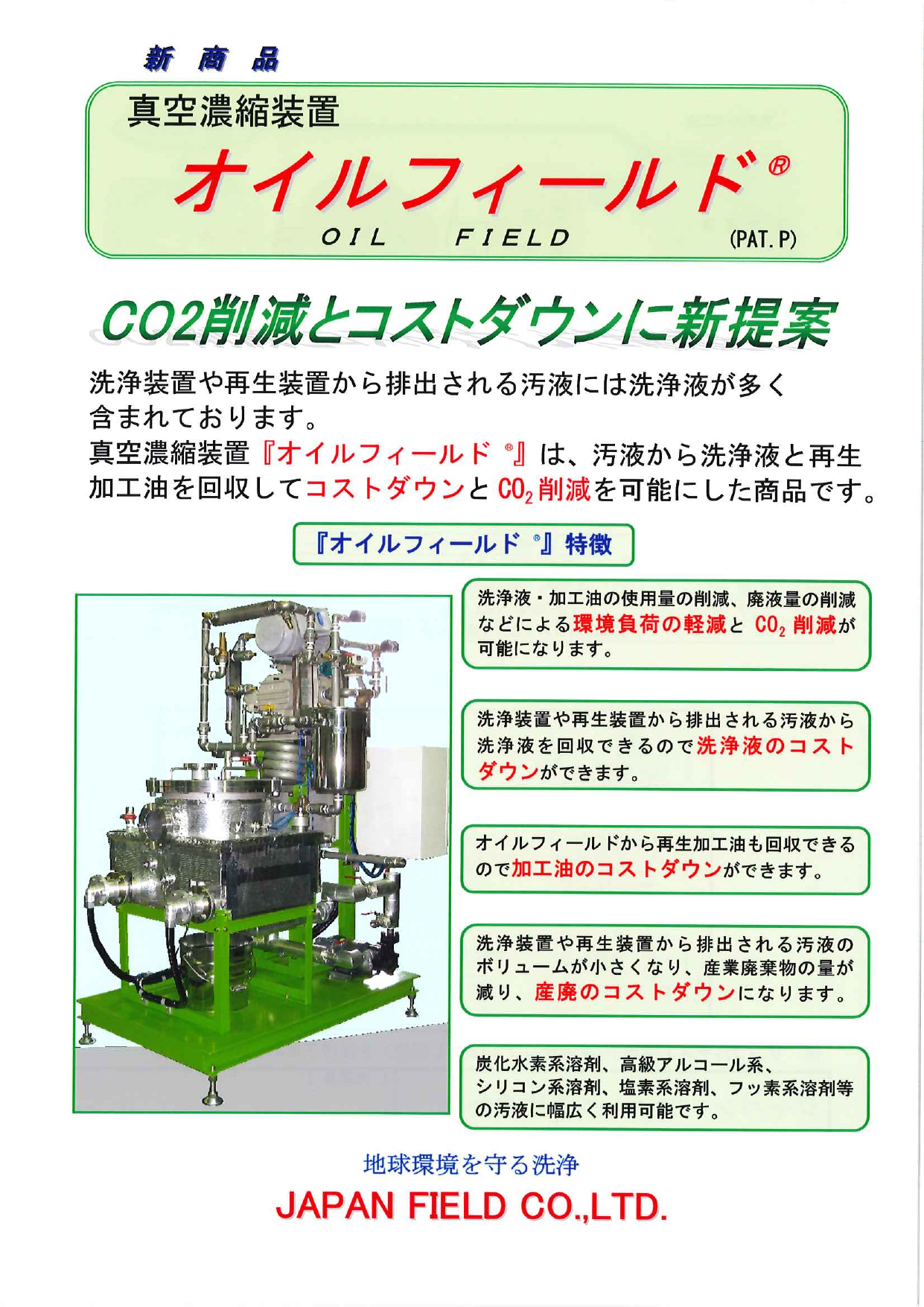 洗浄装置や再生装置から排出される汚液には洗浄液が多く含まれております。真空濃縮装置「オイルフィールド」は、汚液から洗浄液と再生加工油を回収してコストダウンとCO2...