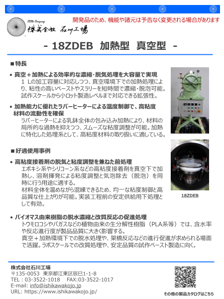 ■特⾧・石川式撹拌擂潰機の基本性能はそのままで、真空中で加熱しながら擂潰処理ができる。・磁器鉢を銅釜で覆い、均一に熱が伝わる機能を有する。・200℃までの加熱を行い...