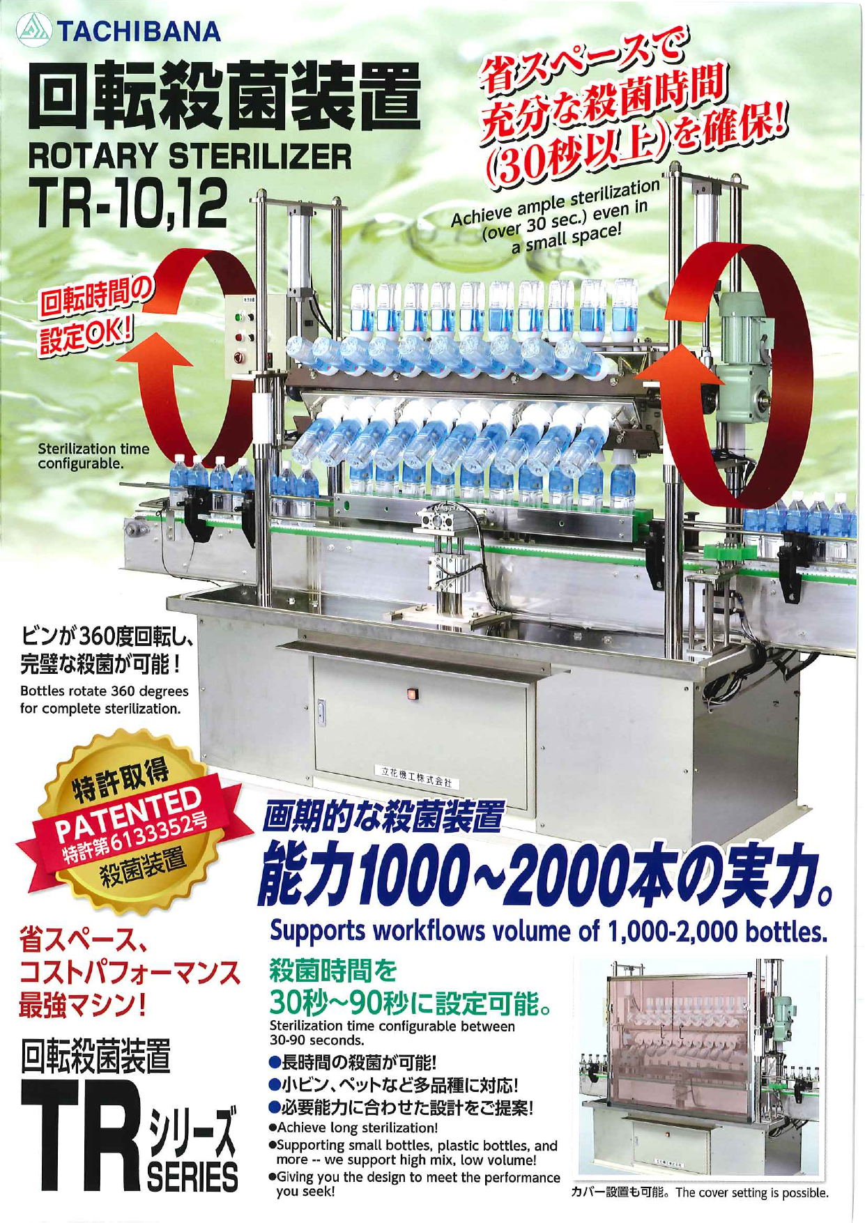 ビンが360度回転し、完壁な殺菌が可能!省スペース、コストパフォーマンス最強マシン!画期的な殺菌装置能力1000~2000本の実力。・長時間の殺菌が可能!・小ビン、...
