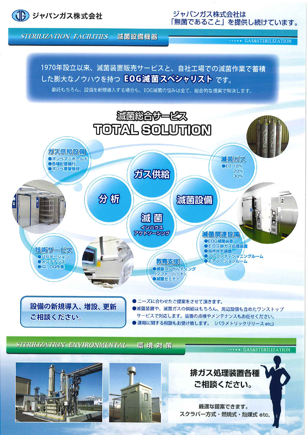 減菌総合サービス トータルソリューション・ニーズに合わせたご提案をさせて頂きます。・減菌装置や、減菌ガスの供給はもちろん、周辺設備も含めたワンストップサービス...