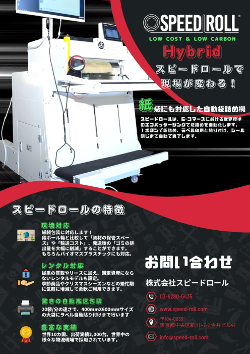 スピードロールHybridは、E-コマースにおける世界標準のミニマルパッケージングスタイルで袋詰め作業を高速且つ簡略化する包装機です。従来のポリ袋はもちろん、紙袋にも対...