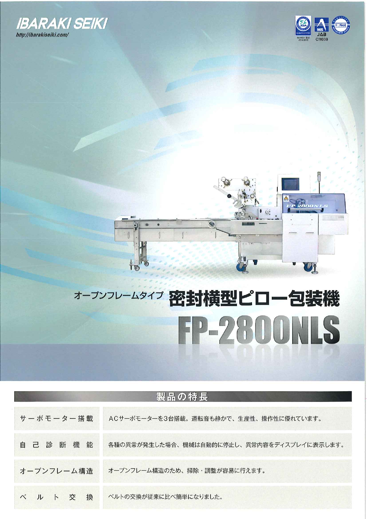 オープンフレームタイプ 密封横型ピロー包装機 FP-2800NLS カタログのご案内です。