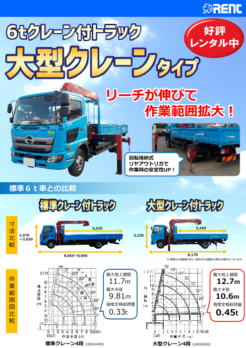 6tクレーン付トラック 大型クレーンタイプをレンタルしております。●6tトラックに大型トラック用のクレーンを採用従来の4段クレーン付トラック(4t車・6t車に搭載)より約0....
