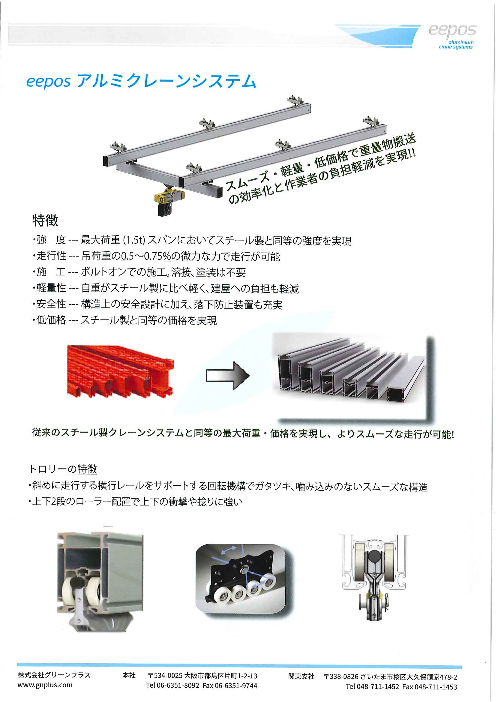 【特徴】強度…最大荷重(1.5t)スパンにおいてスチール製と同等の強度を実現走行性…吊荷重の0.5~0.75%の微力な力で走行が可能施工…ボルトオンでの施工。溶接、塗装は不要...
