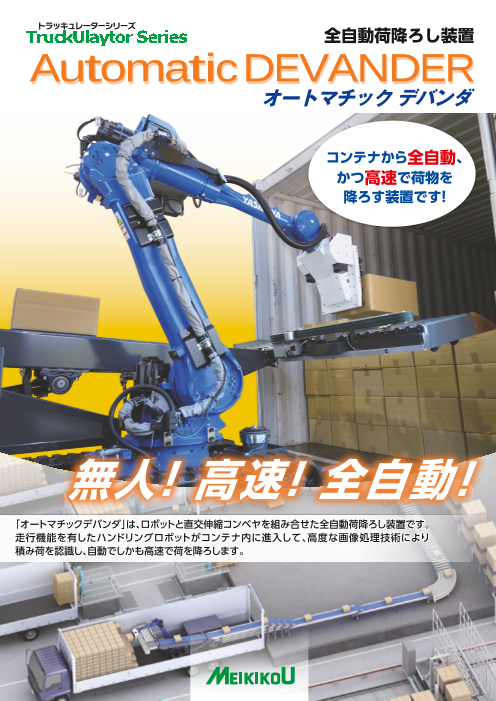 無人! 高速! 全自動!「オートマチックデバンダ」は、ロボットと直交伸縮コンベヤを組み合せた全自動荷降ろし装置です。走行機能を有したハンドリングロボットがコンテナ内に...