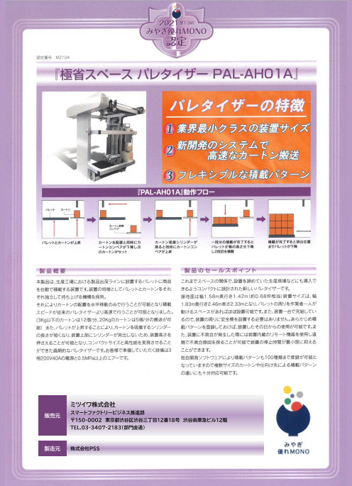 本製品は、これまでスペースの関係で設置を諦めていた生産現場などにも導入できるよう、超コンパクトに設計された新しいパレタイザーです。生産工場における製品出荷ラインに設...