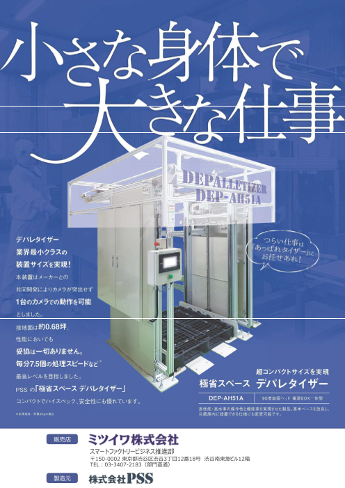 デパレタイザー業界最小クラスの装置サイズを実現!本装置はメーカーとの共同開発によりカメラが突出せず、1台のカメラでの動作を可能としました。設置面は約0.68坪、性能におい...