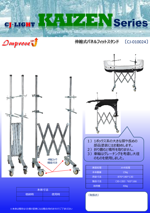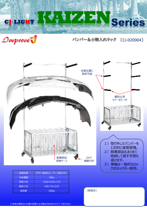 ◆取り外したバンパーを1次的に保管管理。◆脱着部品もまとめて格納して探す手間も省けます。◆車輪は一般的なロック式キャスター使用。◆詳細はカタログをダウンロードしご...