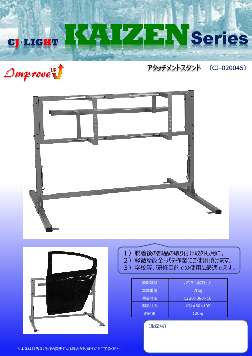 ◆脱着後の部品の取り付け取外し用に。◆軽微な鈑金・パテ作業にご使用頂けます。◆学校等、研修目的での使用に最適です。◆詳細はカタログをダウンロードしご覧いただくか...