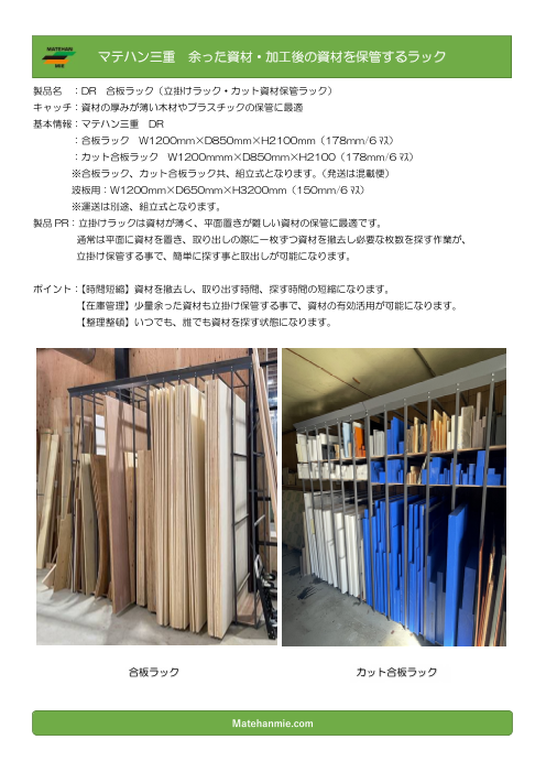 立掛けラックは資材が薄く、平面置きが難しい資材の保管に最適です。通常は平面に資材を置き、取り出しの際に一枚ずつ資材を撤去し必要な枚数を探す作業が、立掛け保管する...