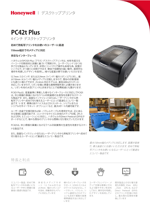 ハネウェルのPC42t Plus(プラス)デスクトッププリンタは、40年を超えるバーコード印刷技術と実績に基づいて開発され、ユーザーフレンドリかつお手ごろな製品となっています。...