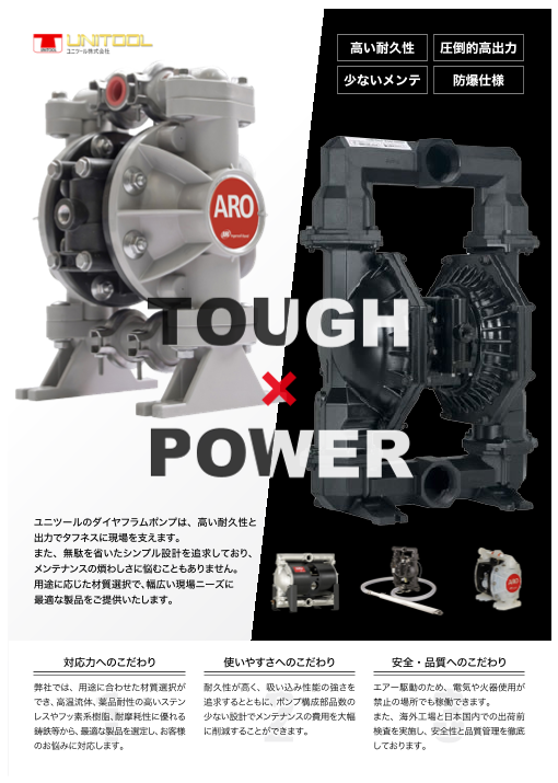 AROブランドのダイヤフラムポンプは、石油・化学工業、金属加工等様々な分野でご利用いただいています。本体・チェックバルブ・ダイヤフラムの材質は用途に合わせてお選び頂...