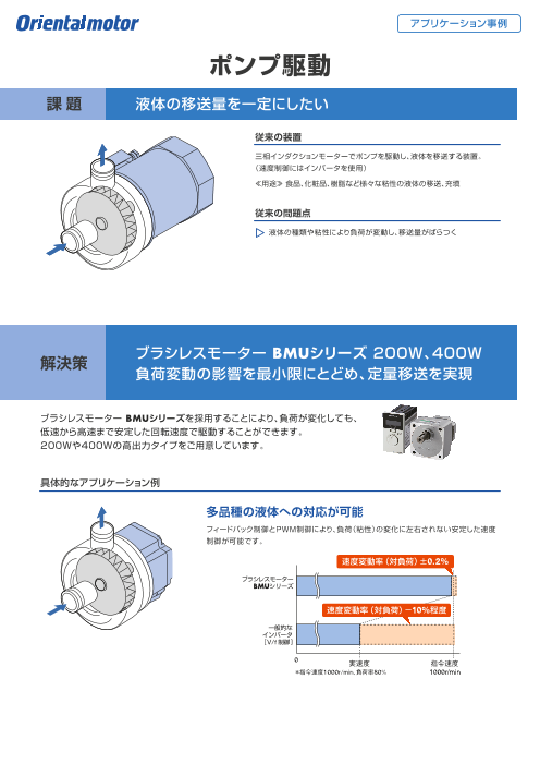 ブラシレスモーター BMUシリーズを採用することにより、負荷が変化しても、低速から高速まで安定した回転速度で駆動することができます。200Wや400Wの高出力タイプをご用意して...
