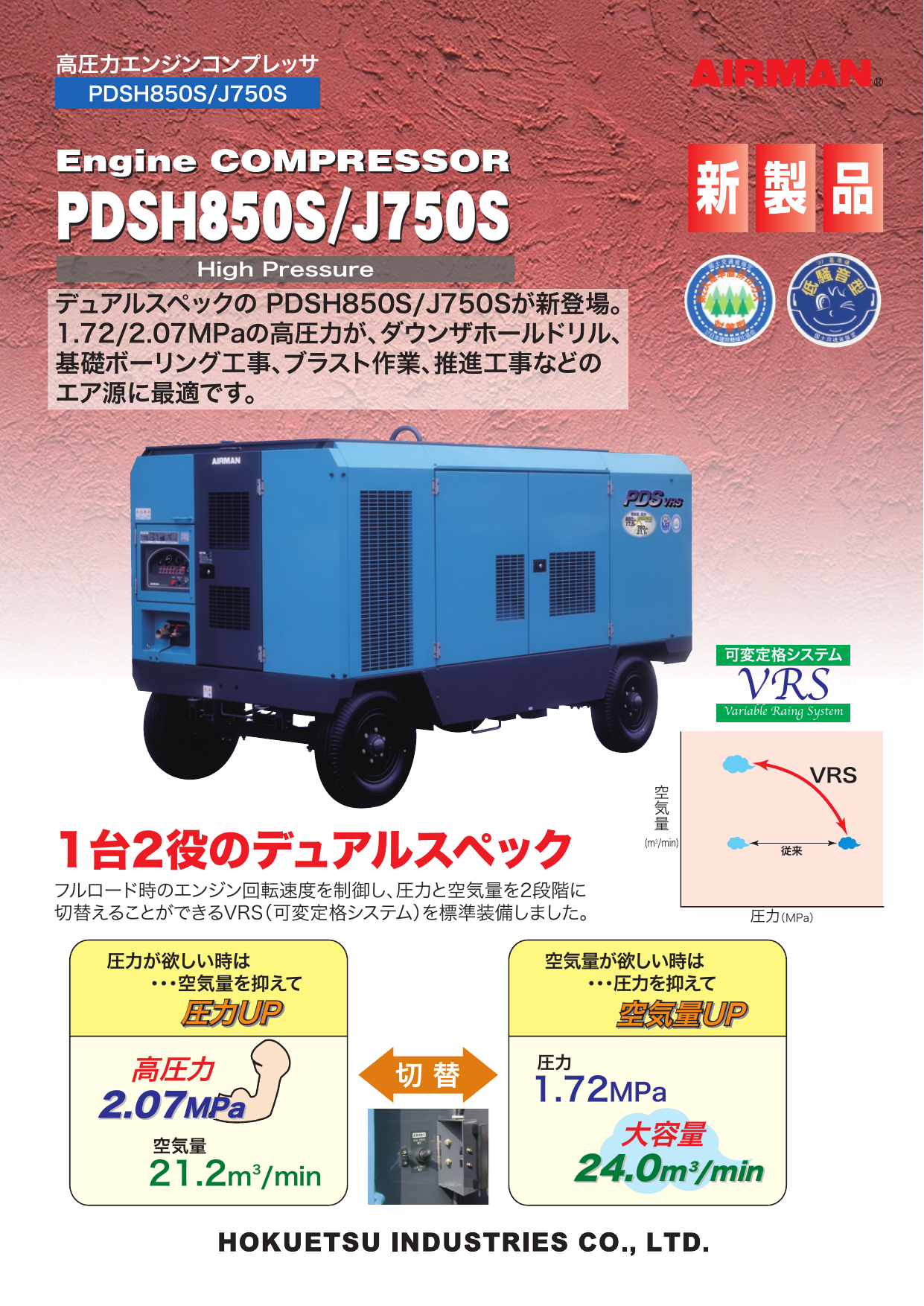 ヒロツから、デュアルスペックの PDSH850S/J750Sが新登場。 1.72/2.07MPaの高圧力が、・ダウンザホールドリル・基礎ボーリング工事・ブラスト作業・推...