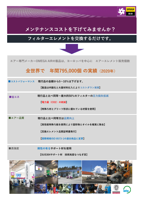 高性能エアフィルターメーカーのOMEGA AIR(オメガエア)では、他メーカー製品に互換性を持つエレメント製品のみの提供もおこなっております。圧縮空気システムは第4のユーテ...