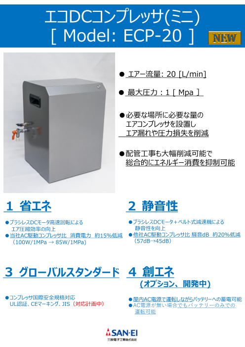 エコDCコンプレッサ(ミニ)は、省エネでブラシレスDCモータを使用し、高速回転によるエア圧縮効率の向上を実現しています。AC駆動コンプレッサーと比較して約15%の低消費電力...
