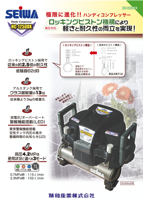 ハンディコンプレッサー HC-1250DXロッキングピストン機構により軽さと耐久性の両立を実現!・従来の2.5倍の耐久性・低騒音62デシベル・アルミタンク採用でクラス最軽...