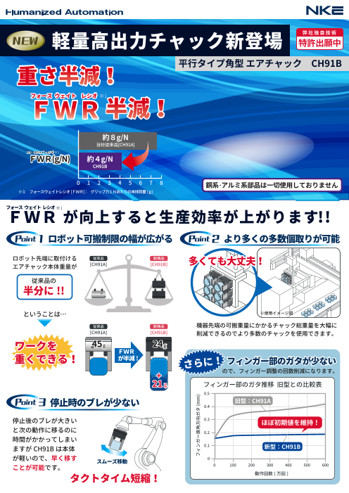 本体質量が軽いのでロボット可搬制限拡張、多数個取りのロボットで一度に取れるワークの個数の増加、ロボット停止時のブレが少なくなり、スムーズな移動でタクトタイムの短縮、...