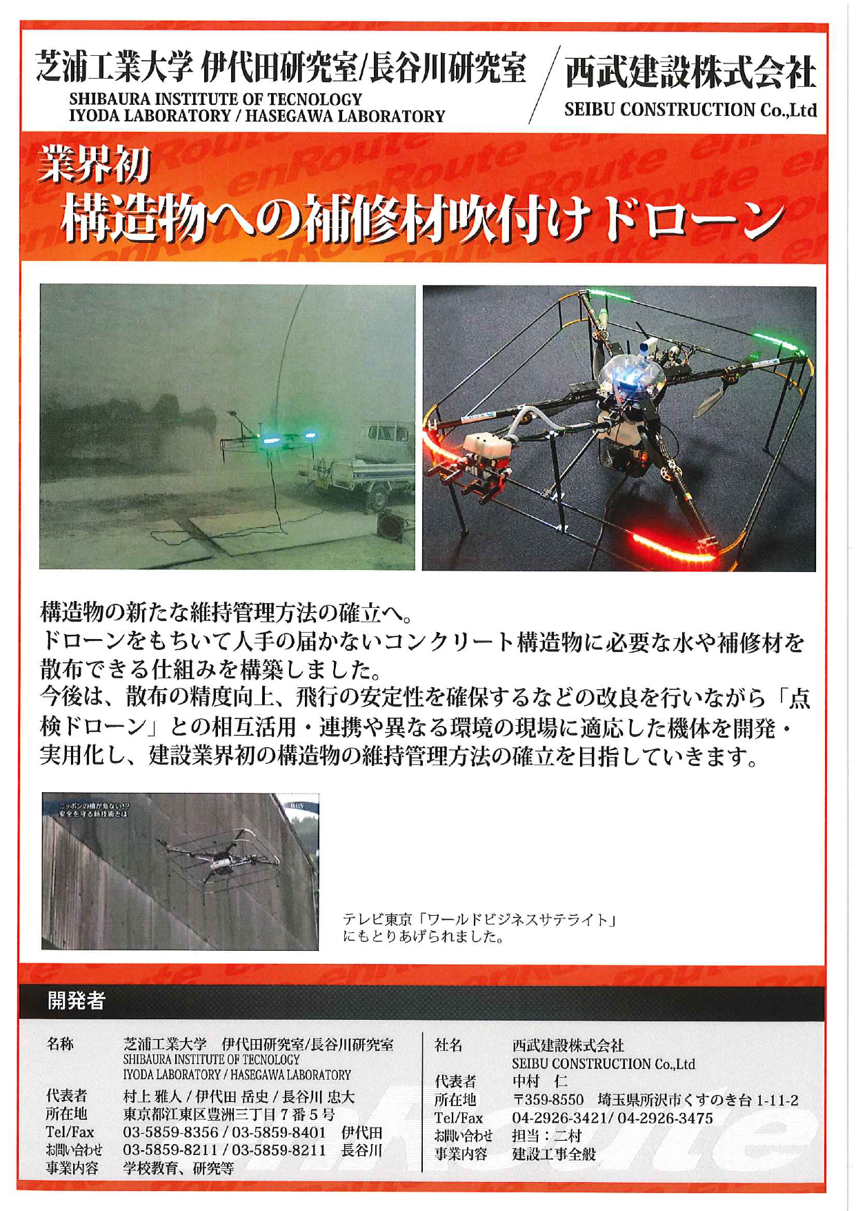 業界初。構造物への補修材吹付けドローン。構造物の新たな維持管理方法の確立へ。ドローンをもちいて人手の届かないコンクリート構造物に必要な水や補修材を散布できる仕組...