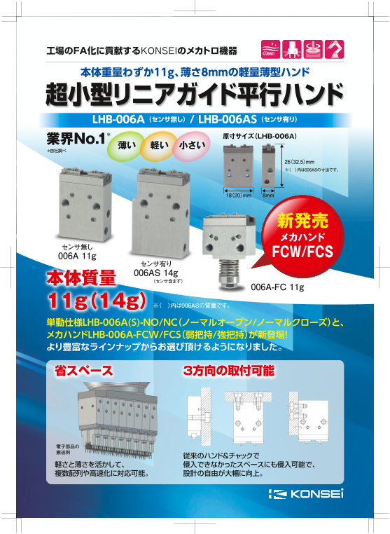 業界NO1の 薄さ・軽さ複動式・単動式・メカ式のラインナップ開閉確認用センサの有無も選択可能です。従来のハンド&チャックで侵入できなかったスペースにも侵入可能...