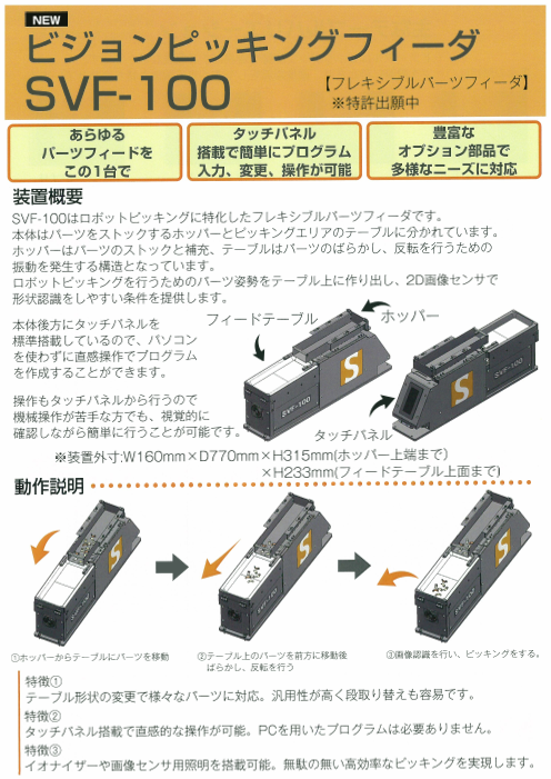 タッチパネル標準搭載により、簡単にパーツの搬送スピードやプログラム登録が可能。外部からのI/O制御により、ホッパー、フィード、バイブレーション(フリップ)を任意にコン...