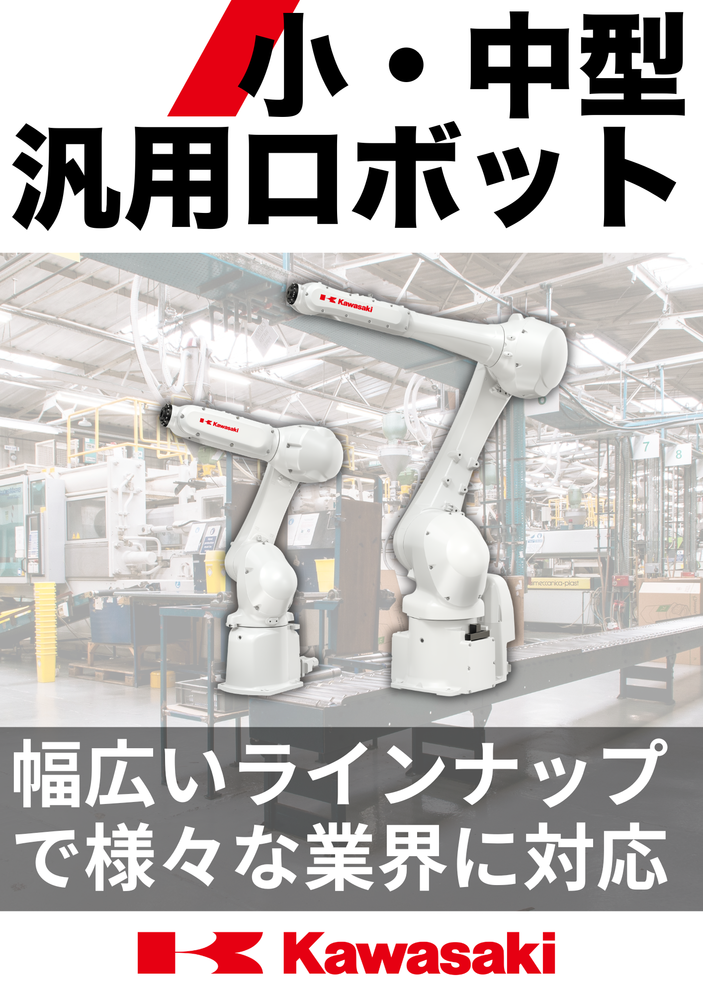 川崎重工の大型汎用ロボット(100~300kg可搬)は豊富なラインアップを揃え、自動車、航空宇宙、機械、金属、電機電子、食品などあらゆる産業分野で活躍しています。適用分野...
