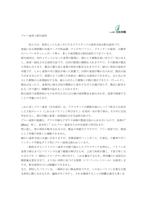 掲載内容◆ブロー成形と射出成形について◆製品事例・自動車用バッテリーダクト・自動車用レゾネーターチャンバー・ハイブリット車用バッテリー冷却ダクト・農機...