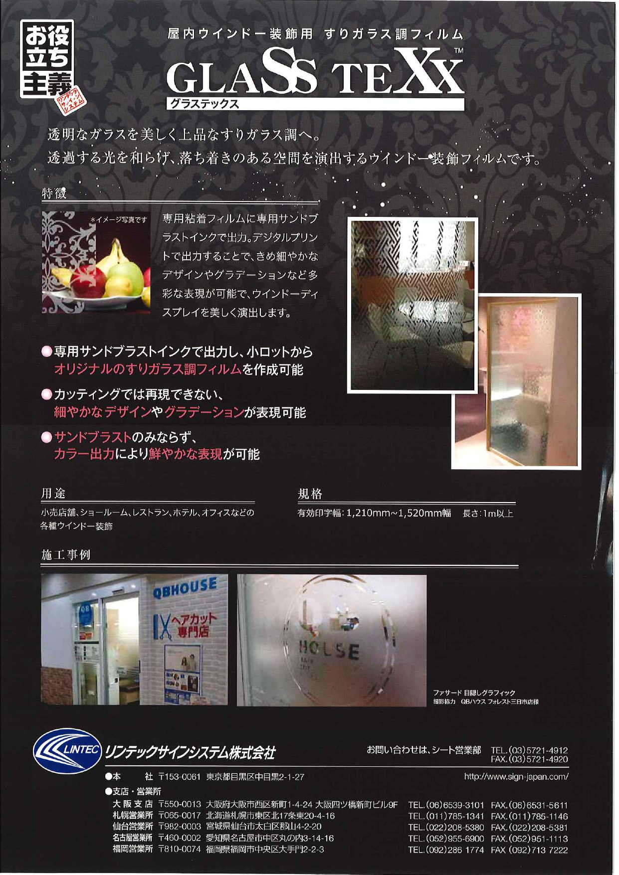 専用粘着フィルムに専用サンドブラストインクで出力。デジタルプリントで出力することで、きめ細やかなデザインやグラデーションなど多彩な表現が可能で、ウィンドーディスプレ...