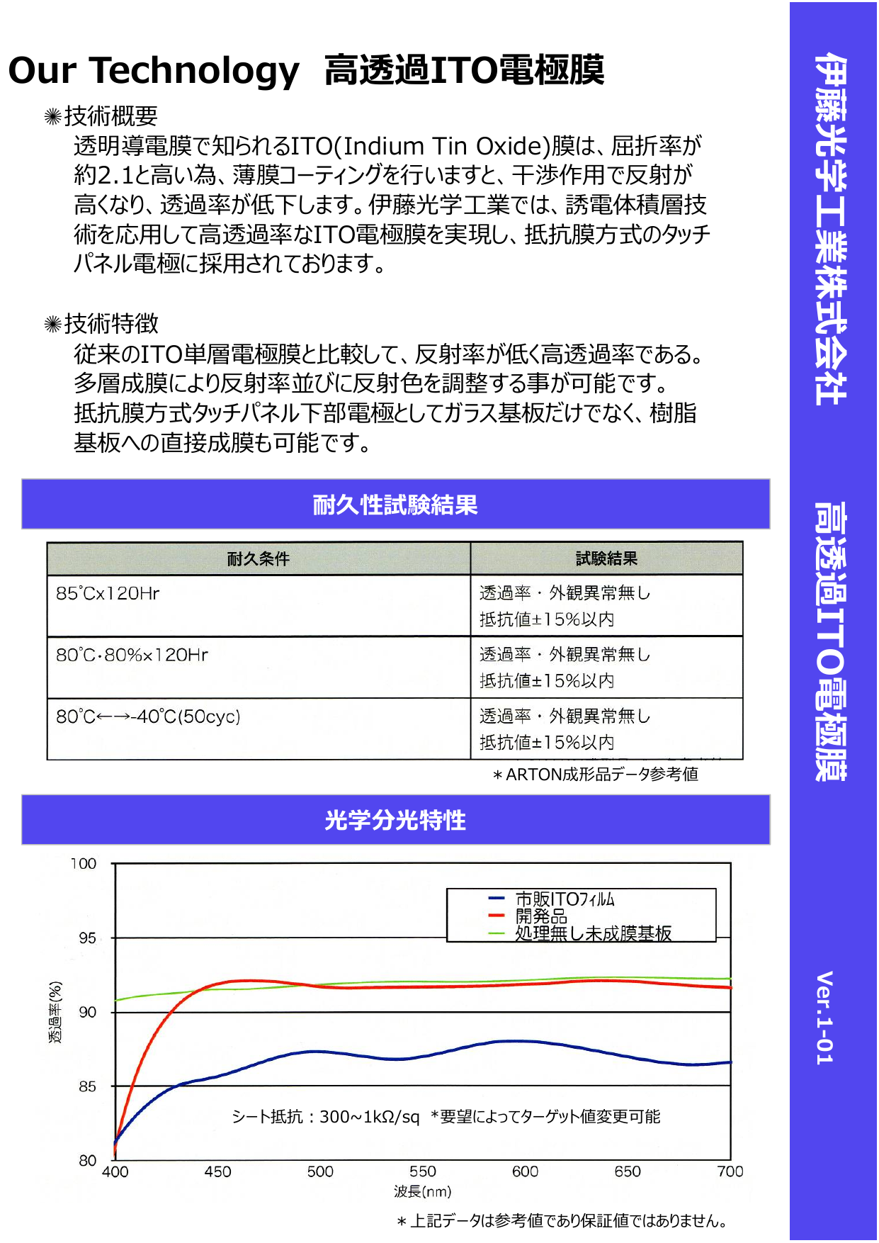 【特徴】○従来のITO単層電極膜と比較して、反射率が低く高透過率○多層成膜により反射率並びに反射色を調整する事が可能です○抵抗膜方式タッチパネル下部電極として ガ...
