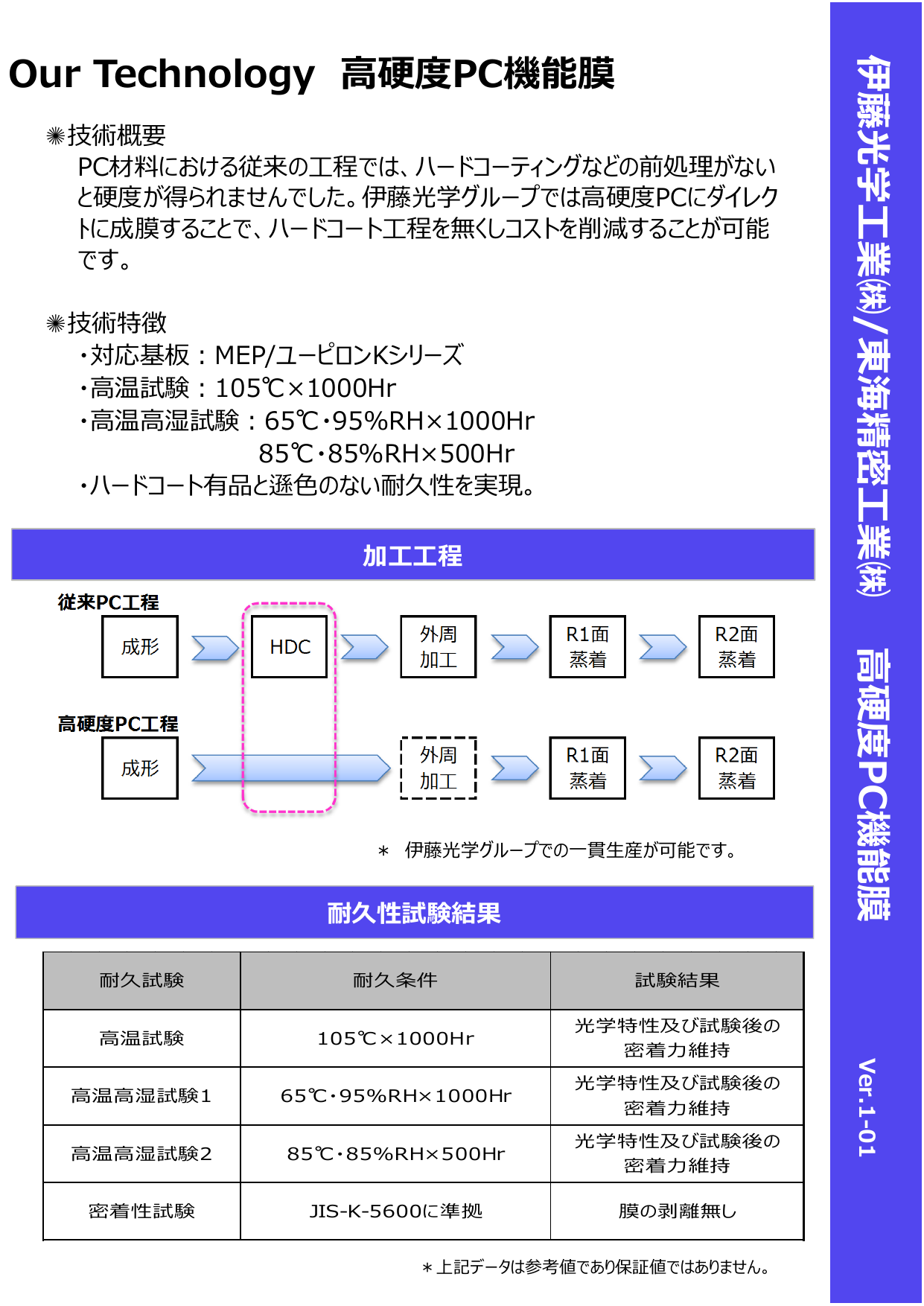 PC材料における従来の工程では、ハードコーティングなどの前処理がないと硬度が得られませんでした。伊藤光学グループでは高硬度PCにダイレクトに成膜することで、ハードコー...