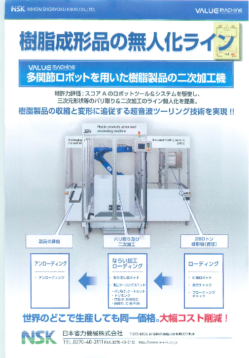 スコアAのロボットツール&システムを駆使し、三次元形状等のバリ取り&二次加工のライン無人化を提案。樹脂製品の収縮と変形に追従する超音波ツーリング技術を実現!!◆...