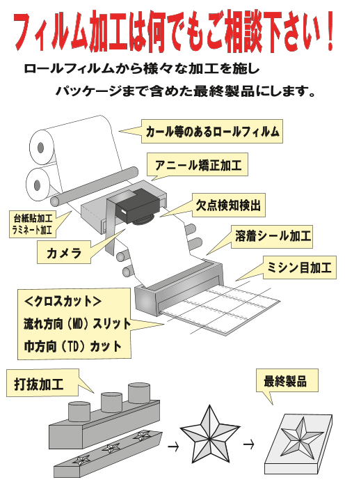 ロールフィルムから様々な加工を施し、パッケージまで含めた最終製品にします。