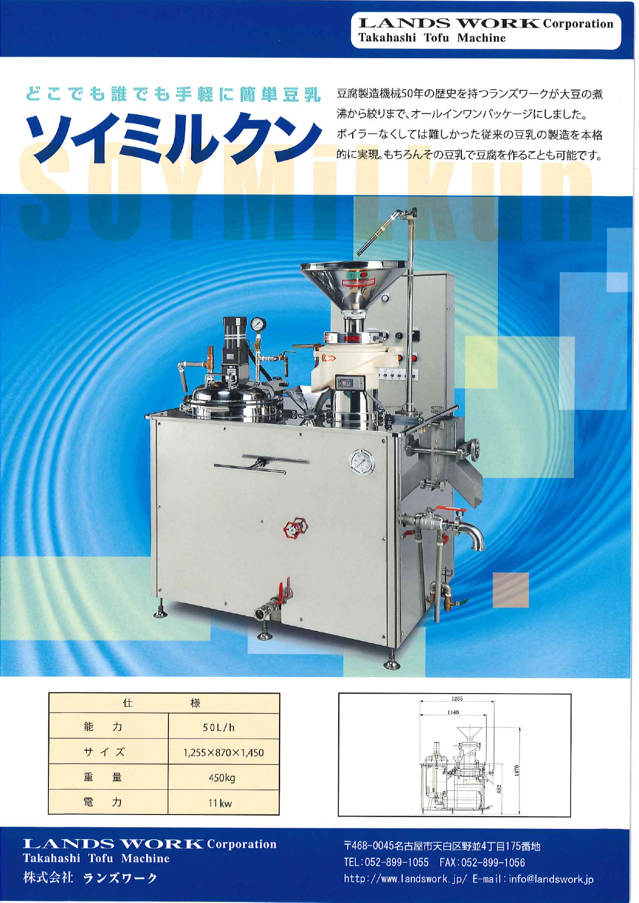 豆腐製造機械50年の歴史を持つランズワークが大豆の煮沸から絞りまで、オールインワンパッケージにしました。ボイラーなくしては難しかった従来の豆乳の製造を本格的に実現。も...