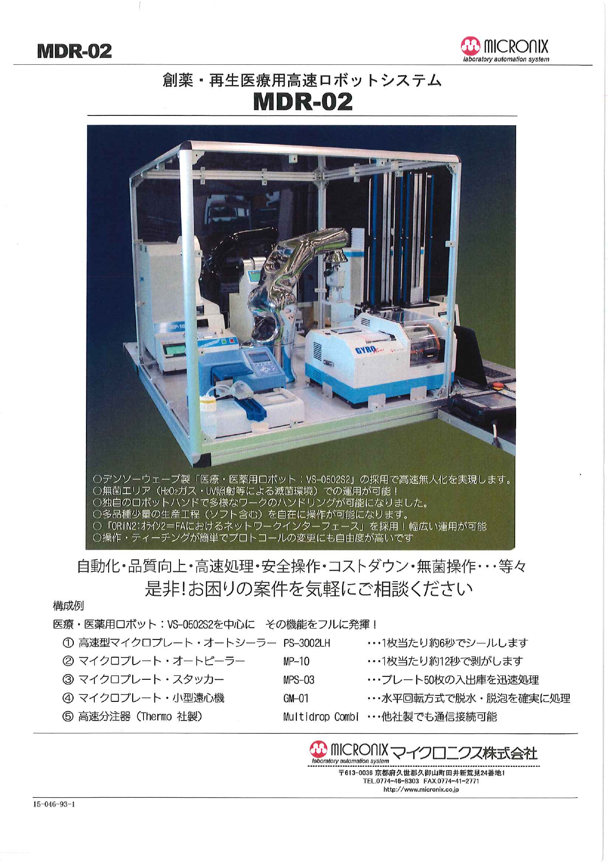 創薬・再生医療用高速ロボツトシステム MDR-02 カタログのご案内です。