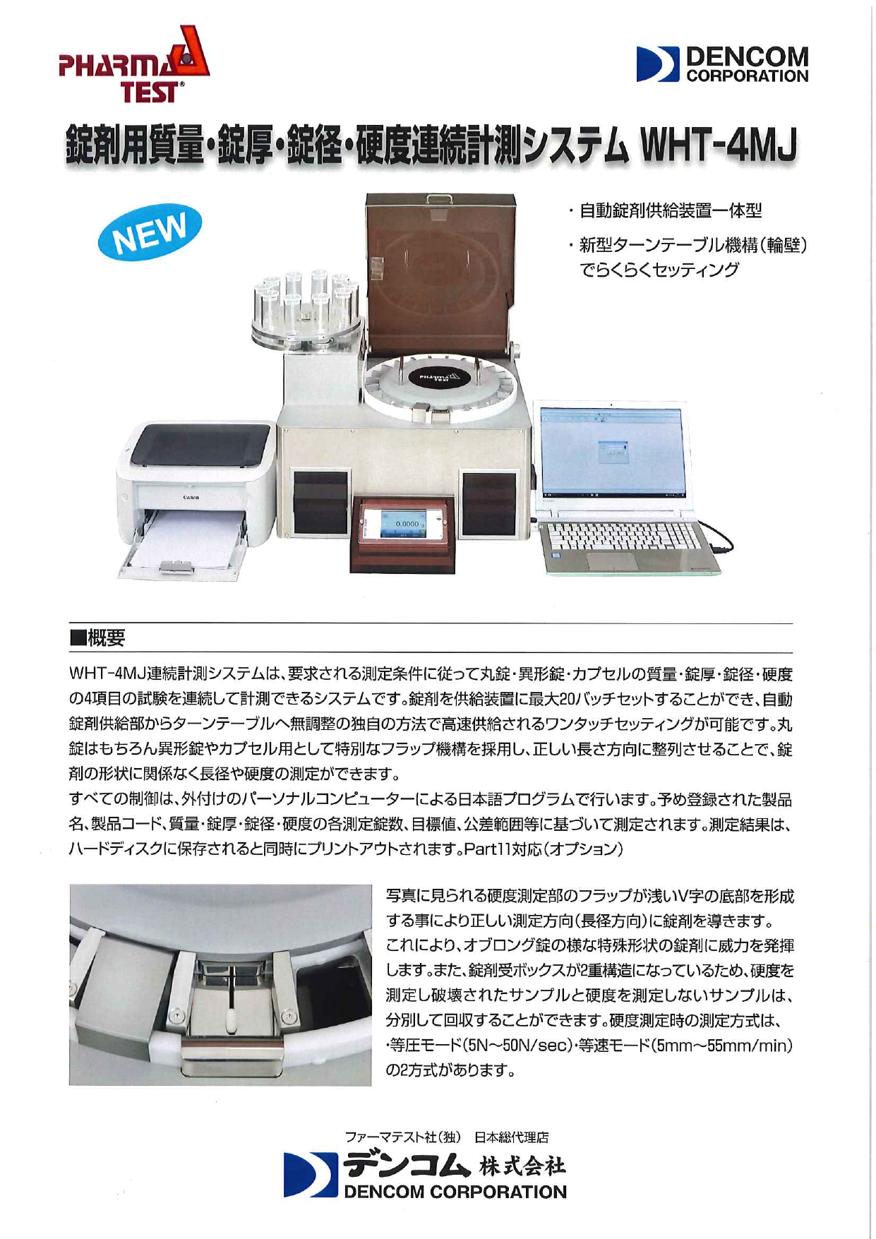 WHT-4MJ連続計測システムは、要求される測定条件に従って丸錠・異形錠・カプセルの質量・錠厚・錠径・硬度の4項目の試験を連続して計測できるシステムです。 錠剤を供給装置に最...