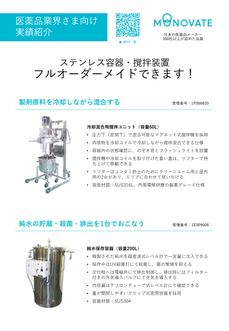 ステンレスタンクや撹拌装置メーカーのMONOVATE株式会社(旧:日東金属工業)です。このPDF資料では、医薬品業界のお客さまに採用された沢山のオーダーメイド事例の中から、一...