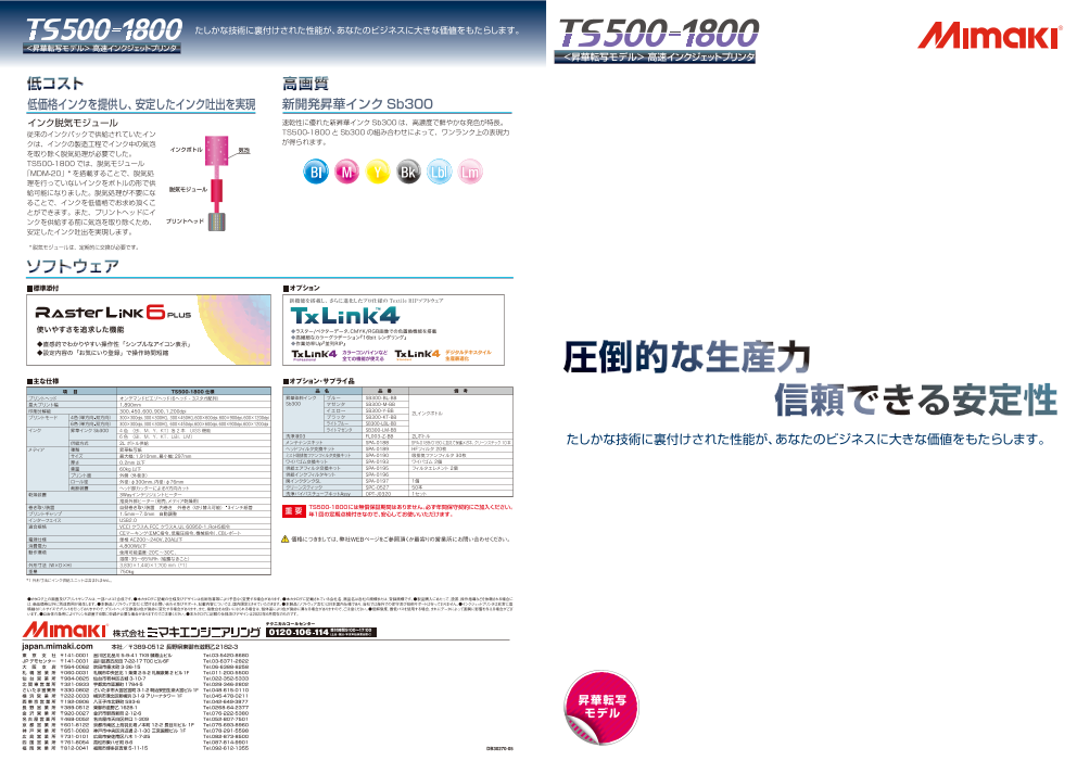 テキスタイルプリントの豊かなカラーグラデーションや技巧をこらした繊細なラインを見事に再現するMimakiのTx300P-1800。Tx300P-1800 MkIIではその機能をさらに進化させ、もう1...