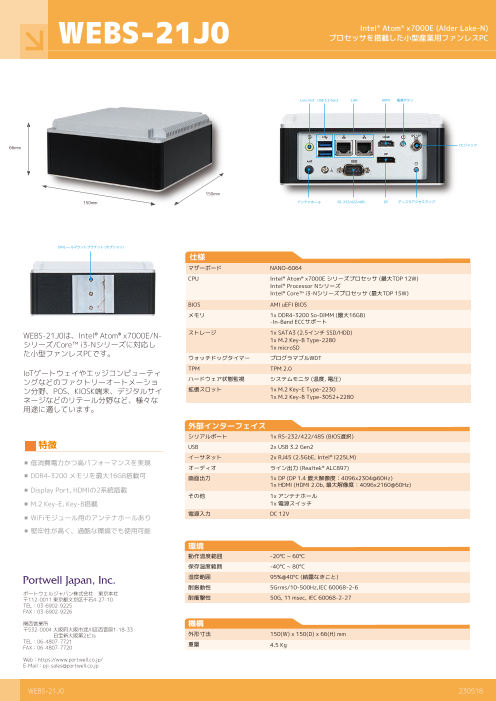 WEBS-21J0は、Intel® Atom® x7000E/N-シリーズ/Core™ i3-Nシリーズに対応した小型ファンレスPCです。IoTゲートウェイやエッジコンピューティングなどのファクトリーオートメー...