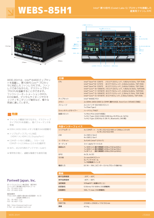 WEBS-85H1は、Intel® W480Eチップセットを搭載し、第10世代 Core™ プロセッサに対応したファンレスPCです。ファンレスでありながらも、デスクトップタイプのCPUを搭載することが...