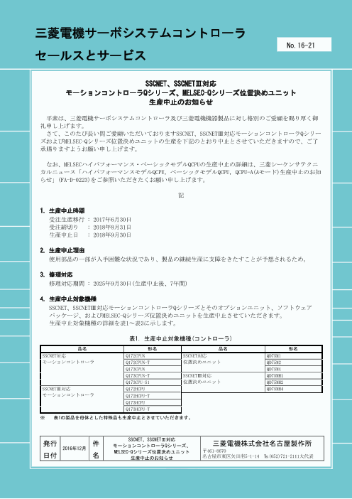 1. 生産中止時期受注生産移行 : 2017年6月30日 受注締切り : 2018年8月31日 生産中止日 : 2018年9月30日2. 生産中止理由使用部品の一部が入手困難な状況であ...