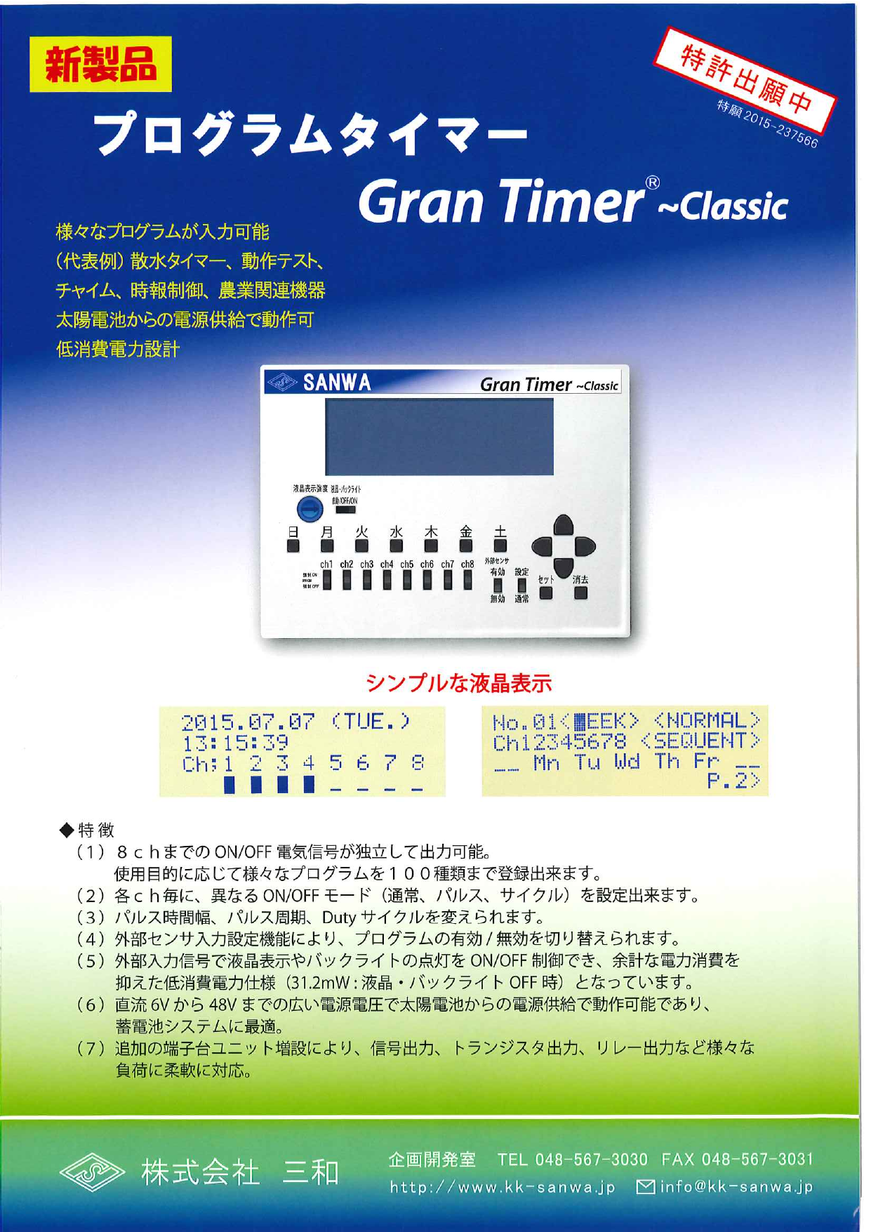 1.8chまでのON/OFF電気信号が独立して出力可能。使用目的に応じて 様々なプログラムを100種類まで登録出来ます。2.各ch毎に、異なるON/OFFモード(通常、パルス、サイクル...