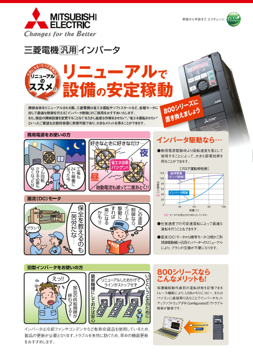 機械本体をリニューアルされる際、三菱電機は省エネ運転やソフトスタートなど、各種モータに対して最適な制御を行える「インバータ制御」のご採用をおすすめいたします。また、...