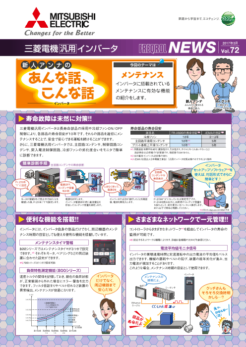 掲載内容◆寿命故障は未然に対策!三菱電機汎用インバータは長寿命部品の採用や冷却ファンON/OFF 制御により、各部品の寿命目安が10年です。それらの部品を適切にメン ...