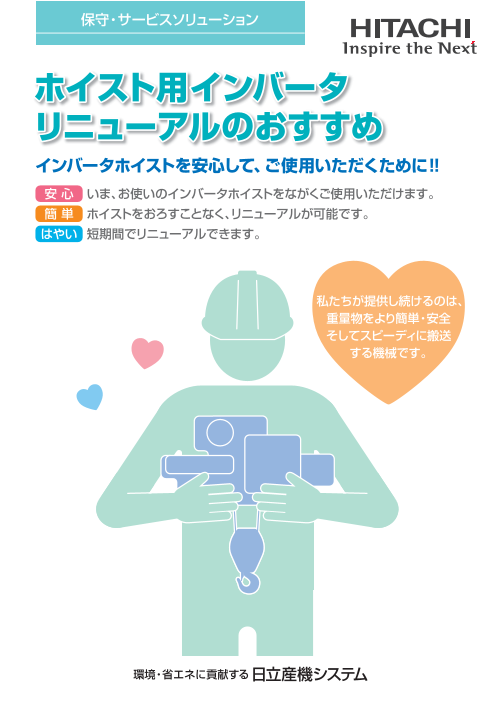 私たちが提供し続けるのは重量物をより簡単・安全、そしてスピーディに搬送する機械です。安心:いま、お使いのインバータホイストをながくご使用いただけます。簡単:ホ...