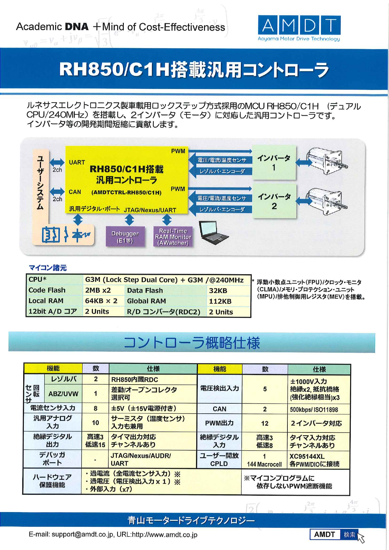 RH850/C1H搭載汎用コントローラ・ルネサスエレクトロニクス製車載用ロックステップ方式採用のMCU RH850/C1H(デュアル CPU/240MHz)を搭載し、2インバータ(モータ)に対応した...