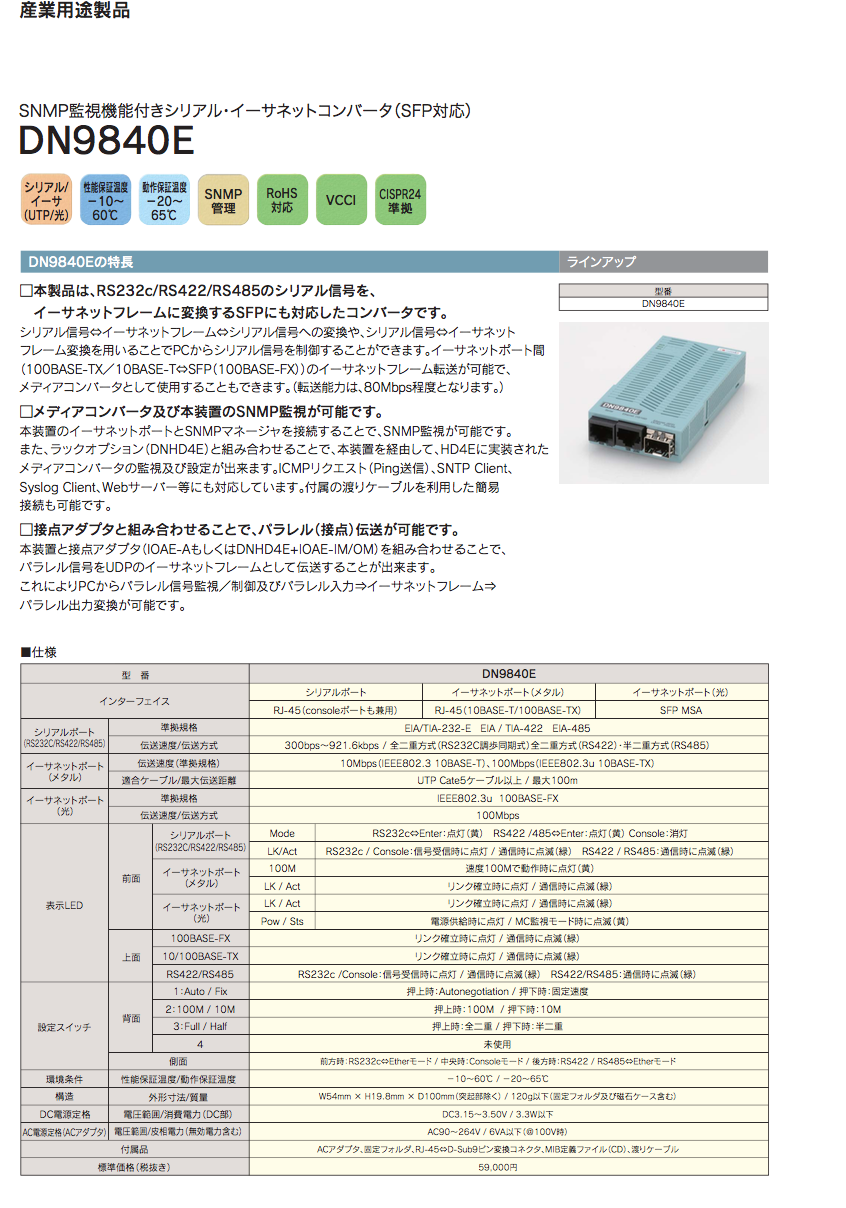 本製品は、RS232c/RS422/RS485のシリアル信号を、イーサネットフレームに変換するSFPにも対応したコンバータです。シリアル信号⇔イーサネットフレーム⇔シリアル信号への変...