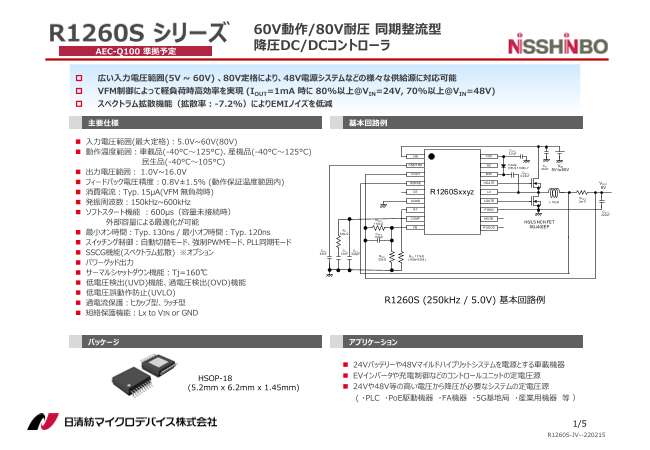 ・VFM制御によって軽負荷時高効率を実現 (IOUT=1mA 時に 80%以上@VIN=24V, 70%以上@VIN=48V)・スペクトラム拡散機能(拡散率:-7.2%)によりEMIノイズを低減◆詳細はカタロ...