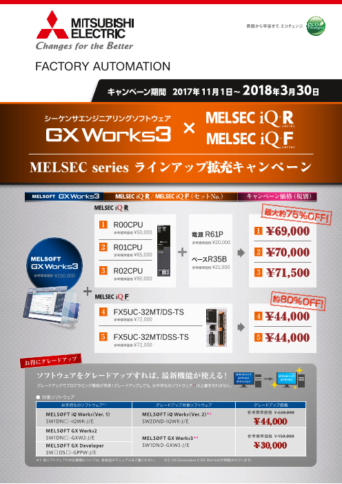 【キャンペーン期間:2017年11月1日~ 2018年3月30日】○GX Works3 快適な操作性と豊富な便利機能により作業効率が大幅にアップします。○MELSEC iQ-R series MELSEC i...