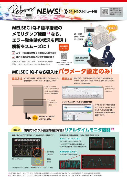 MELSECiQ-F標準搭載のメモリダンプ機能なら、エラー発生時の状況を再現!エラー情報を自動的にSDメモリカードに収集送られてきた情報を事務所で解析解析をスムーズに!...